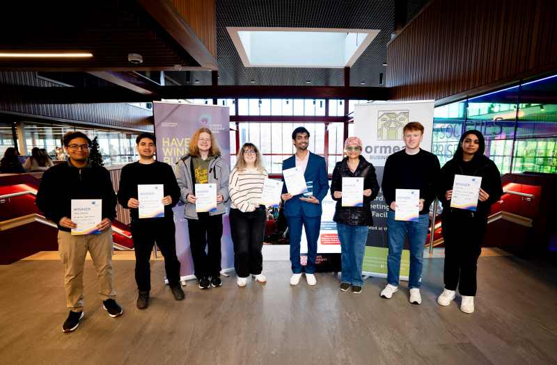 (L-R) Abhay Shivamurthy (Best Business Idea from the Creative Industries), Farraz Shah (Best Business Idea from a Postgraduate), Rory MacNeill (Best Idea for a Social Enterprise), Grace McShane(Most Innovative Business Idea), Yogiraj Jakkal (Best Overall Business Idea, Best Climate Impact Idea, and Best Business Idea from an International Student), Sanam Jain (Best Business Idea from a Woman), Oliver Woodward (Best Use of AI in a Business Idea), and Saira Nagi (Best Business Idea from a First Year).